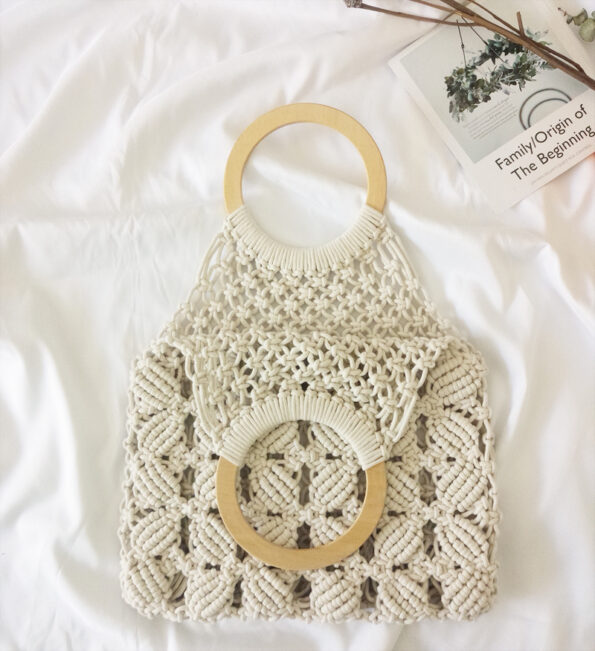 1. Hansenne retro literary style, shell woven bag, round wooden handle, handbag, handmade, cotton rope weaving, hollow woven bag;